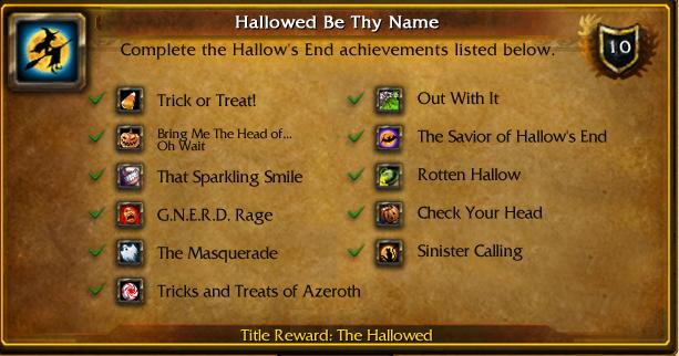 ဒီ achievement ေလးက . . . Innkeeper ေတြ ဆီကေန Trick or Treat! လုပ္လုိ႔ ရတဲ့ [Treat Bag] ေလးေတြ ရယ္ . . . Candy Bucket ေလးေတြ ကေန ရတဲ့ [Handful of Candy] ေလးေတြ ဆီ ကေန . . . ရမယ့္ << [Hallowed Wand - Ghost] [Hallowed Wand - Leper Gnome] [Hallowed Wand - Pirate] [Hallowed Wand - Skeleton] [Hallowed Wand - Bat] [Hallowed Wand - Ninja] [Hallowed Wand - Wisp] >> ေလးေတြ နဲ႔ party invite လုပ္ျပီး အခ်င္းခ်င္း ေျပာင္းေပးရမွာပါ။ တစ္ခု သတိထားရမွာ က ကိုယ့္ ဟာ ကုိယ္ ေျပာင္းလုိ႔ မရပါဘူး။ သူမ်ား က ေနျပီးေတာ့ မွ ကုိယ့္ ကုိ ေျပာင္းေပးမွ ရမွာပါ။ အဲ့ ေတာ့ Wand ရွိတဲ့ သူအခ်င္းခ်င္း အကူအညီ ေပးလုိ႔ ရပါတယ္။
